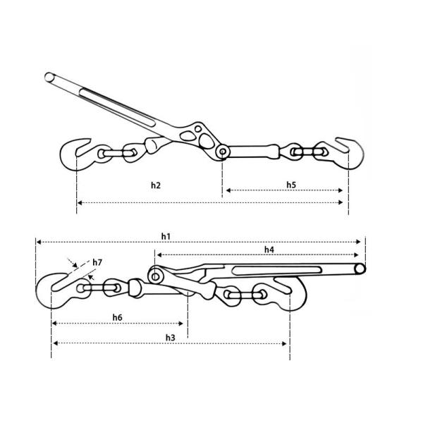 | Min-Max Chain Size (in.) | Working Load Limit (lbs) | Proof Load (lbs) | Minimum Ultimate Load (lbs) | Weight (lbs) | Handle Length (in.) | Dimensions (in.) | ||||||